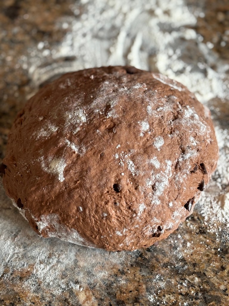 - On lightly floured surface, knead dough and add in chocolate chips.