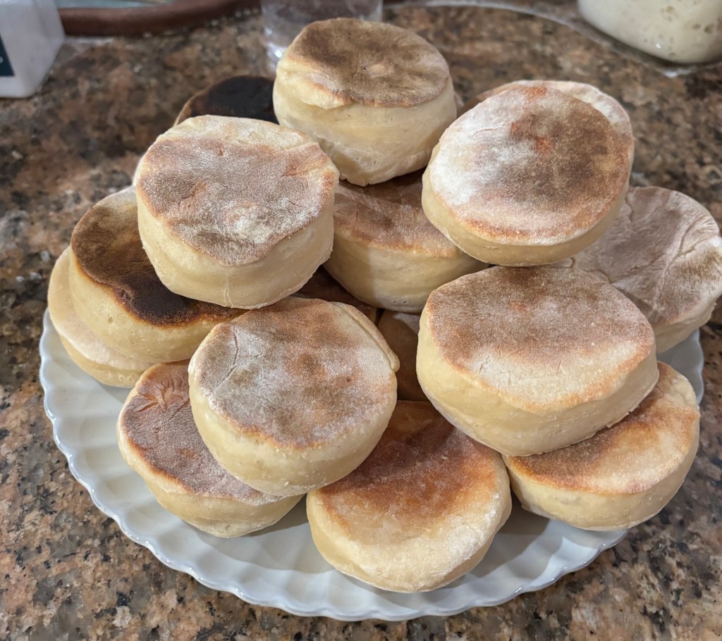 We never buy english muffins. I make them about once a week, with a recipe that was given to me by a friend. These make for an easy snack, whether at home or on-the-go.