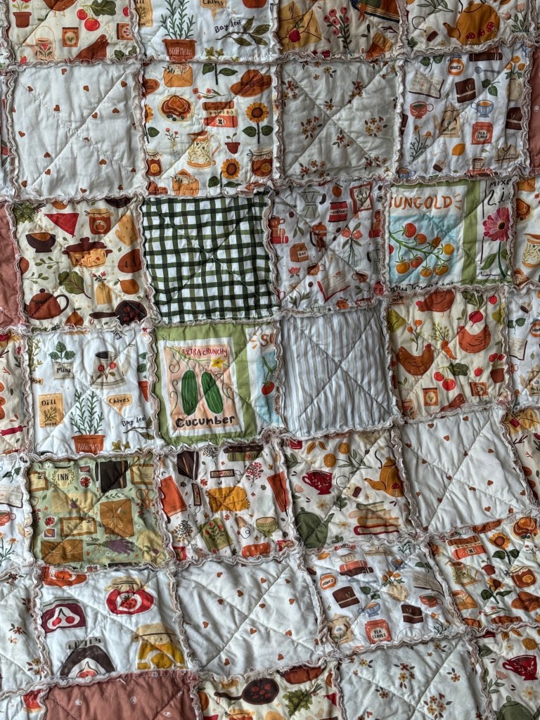 When I was a child, one of my close friends had a rag quilt, and I remember loving it so much. I spent about 20 years wanting one before I finally just made myself one recently. The process is time consuming but definitely worth it. I am not really a pattern type of person, I tend to “wing it” a lot. There are a few things I would do definitely, but I love how it turned out so much. I took me a while to pick out fabric because I wanted it to have a little bit of everything that I love. When I was looking at Spoonflower, I found an artist and instantly loved every pattern. It was hard to pick designs because I wanted them all. The artist’s name is ohjessmarie. I highly recommend checking out all of the art whether for fabric or a phone screen wallpaper.