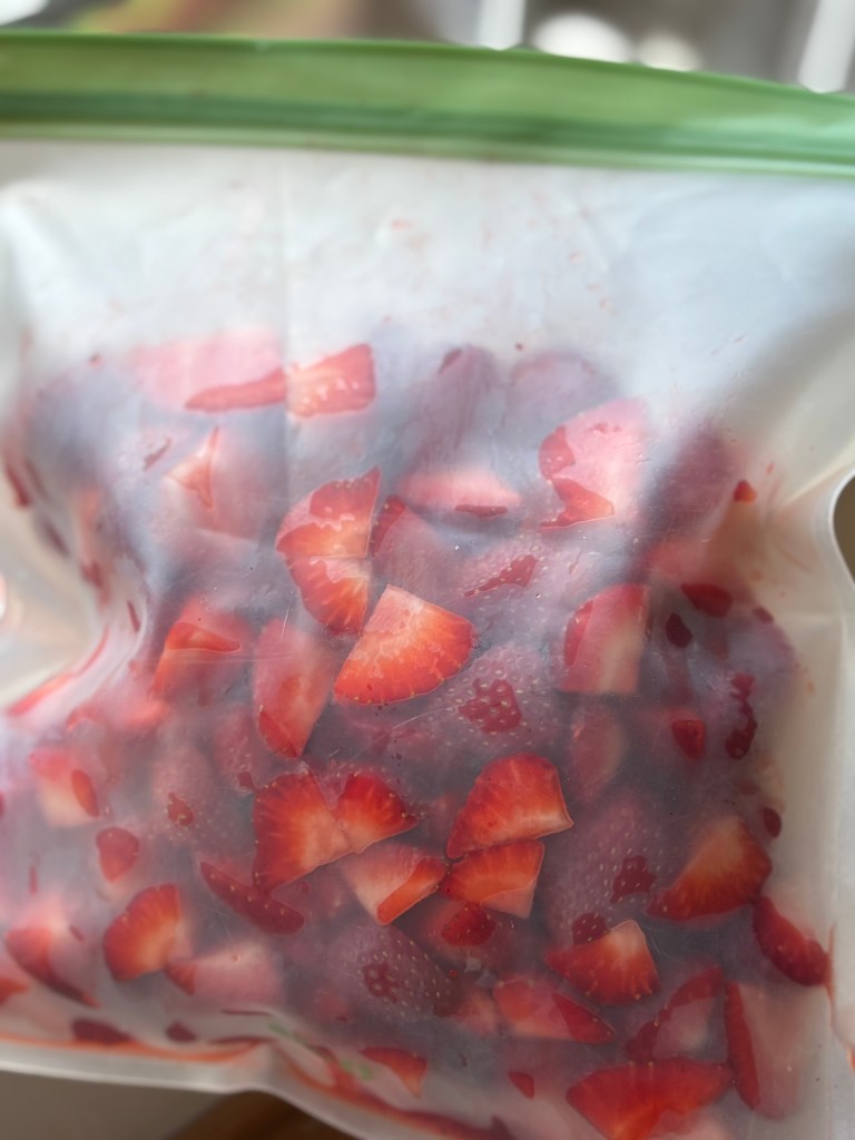 I like to use reusable bags for the strawberries that I store in the freezer for future use. The main use for our frozen strawberries is making smoothies during summer.