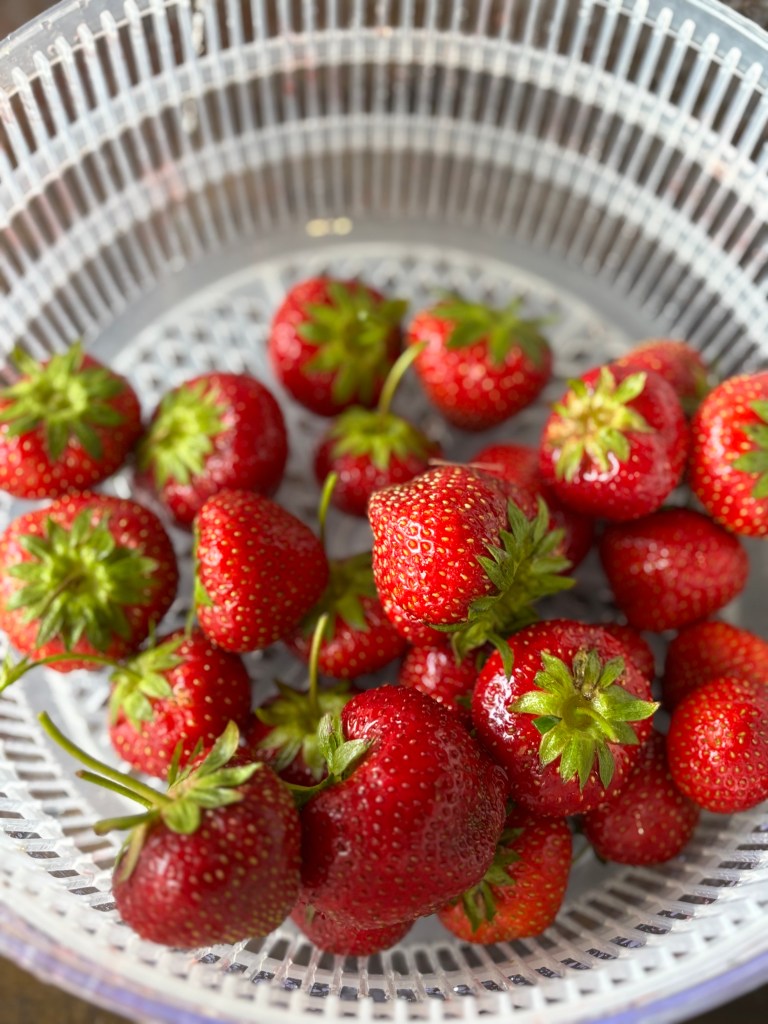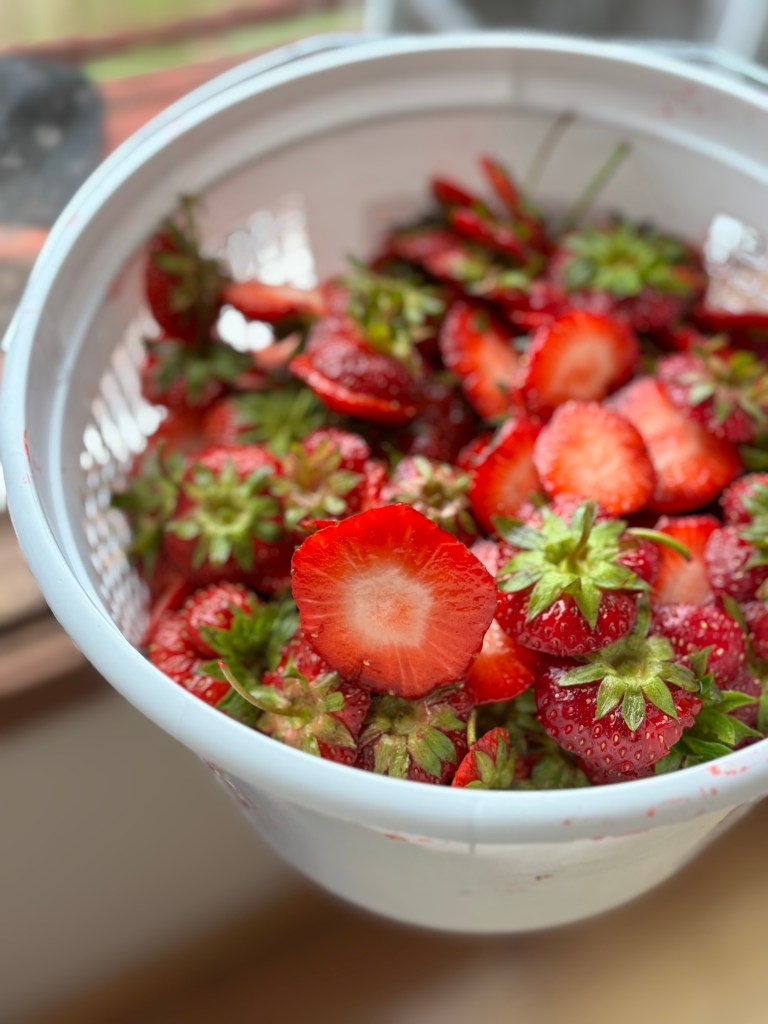 We cut the tops off of the strawberries. Although there are ways to cut strawberries for less waste, we do it this way so that we can give our chickens and ducks a tasty snack.