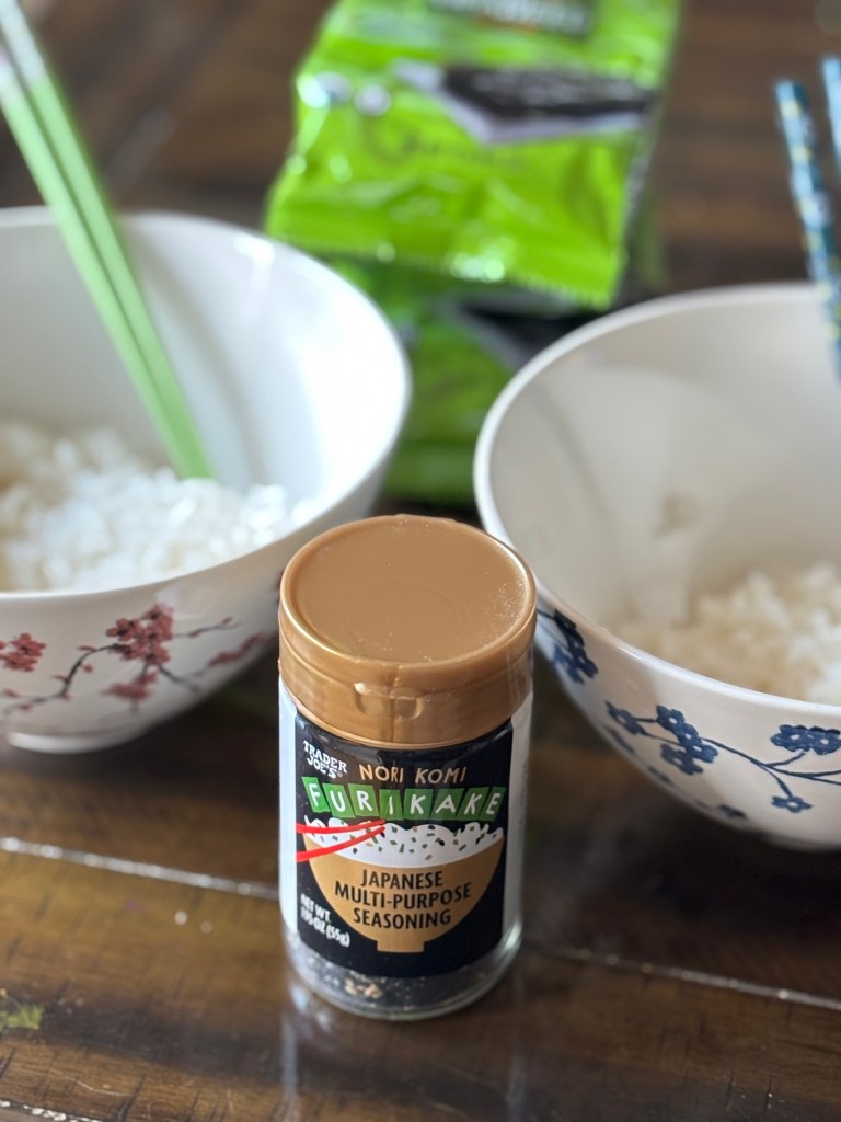 The bowls pictured only have rice, furikake, and spam in them. However, some toppings that we use depending on our moods are soy sauce, and teriyaki. Which if I am going to use either of those, I will cook the spam in it on the stovetop. But my child was not feeling that today. So we went very plain. My husband likes to add his own toppings to everything, so he likes to add bbq sauce. I also like to do kewpie mayo and then eat it in roasted seaweed. I hope you try this quick and simple lunch out and enjoy!