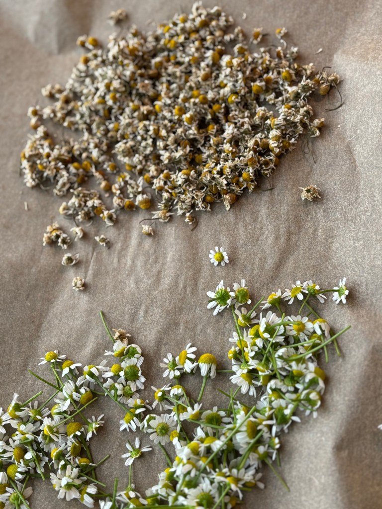 The first few times we picked chamomile we had to clean it multiple times because we would find bugs later. But now that we figured out cleaning it, we don’t have as many problems. We use a tray with parchment to dry the chamomile with sunlight and air. It takes about 2-3 days to fully dry.