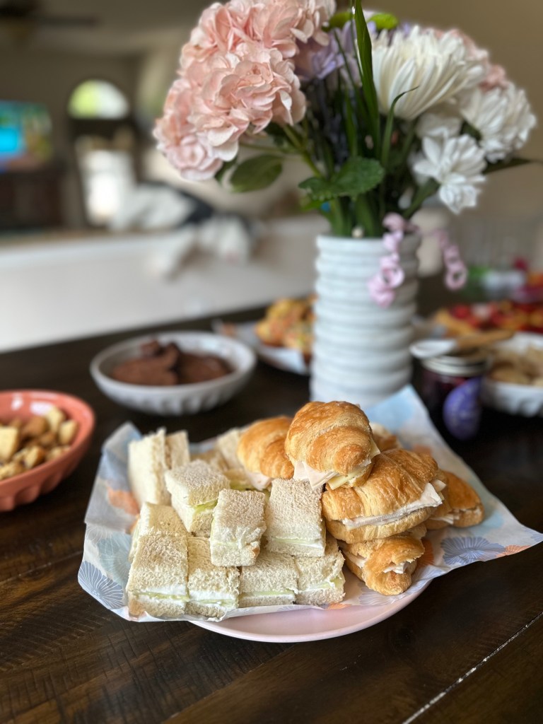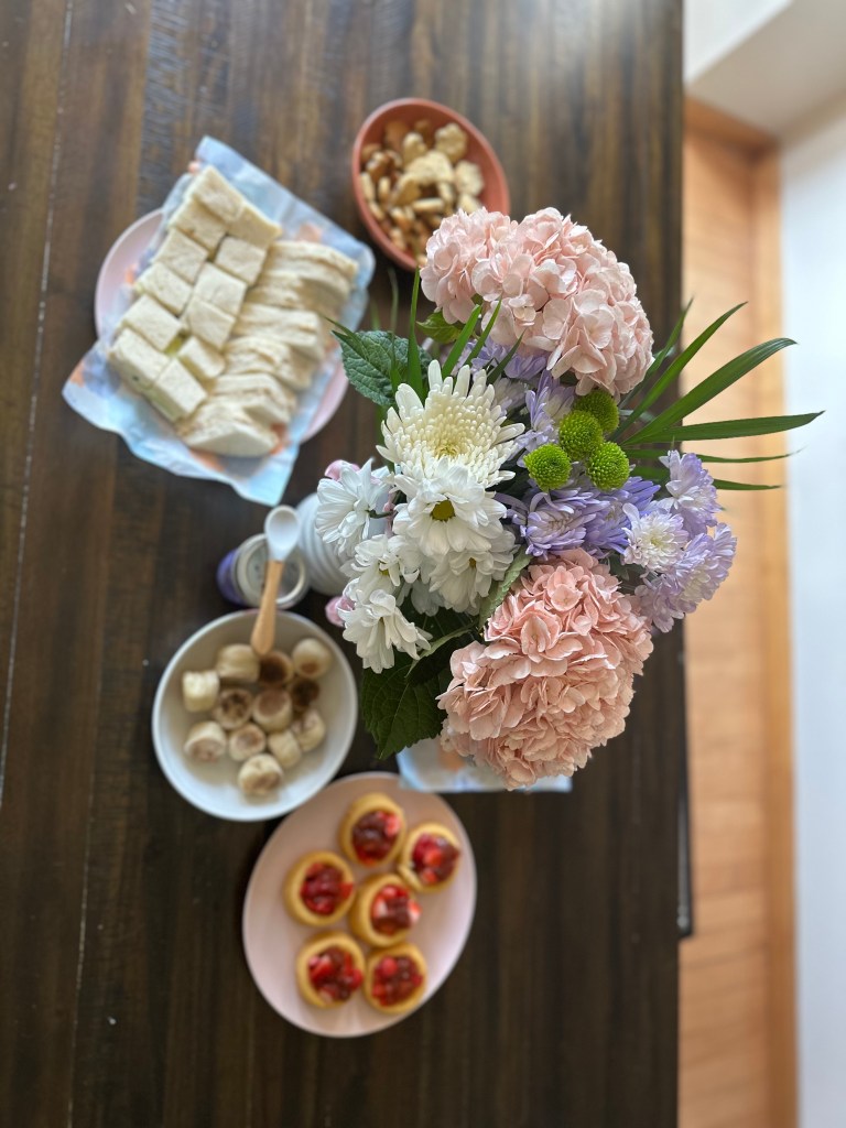 Last year, I wanted to have a birthday party for my sister-in-law. She likes Bridgerton, so it felt like the obvious thing to do was to have a tea party. My mom and I made different things to eat. I made heart and flower shaped brownies and chocolate chip cookies, and mini sourdough english muffins.
