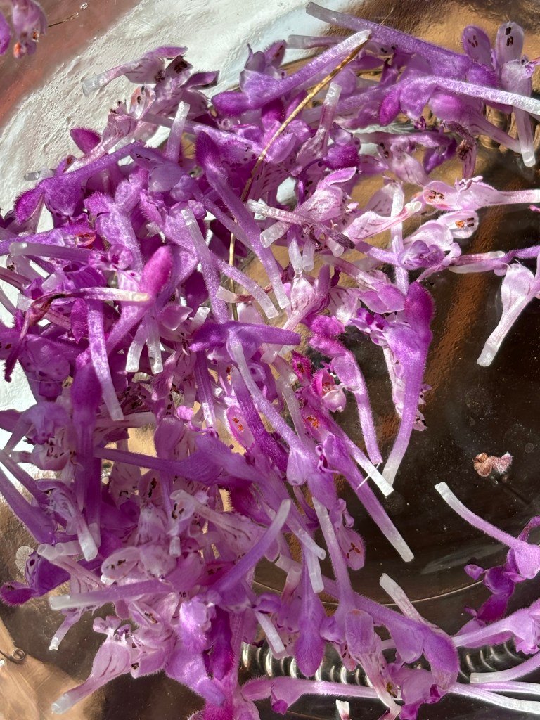 We also collected a lot of henbit and purple dead nettles. Although we left a lot of spots for this to grow wildly for the bees, we also gave a lot of it to our chickens. They produced the most beautiful orange yolks during this time. Lastly, we collected white clovers, red clovers, and dandelions.